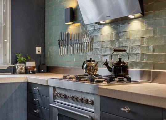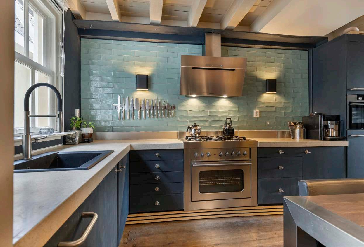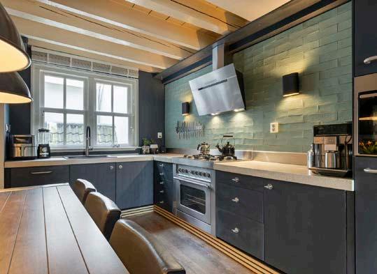 Rechts kom je in de halfopen keuken, die van alle gemakken is voorzien. Een 5-pits gasfornuis, RVS afzuigkap, vaatwasser, een separate ATAG stoomoven en een Amerikaanse koelkast – hier kom je niets tekort. De keuken heeft een moderne uitstraling en loopt mooi over in de woonkamer.