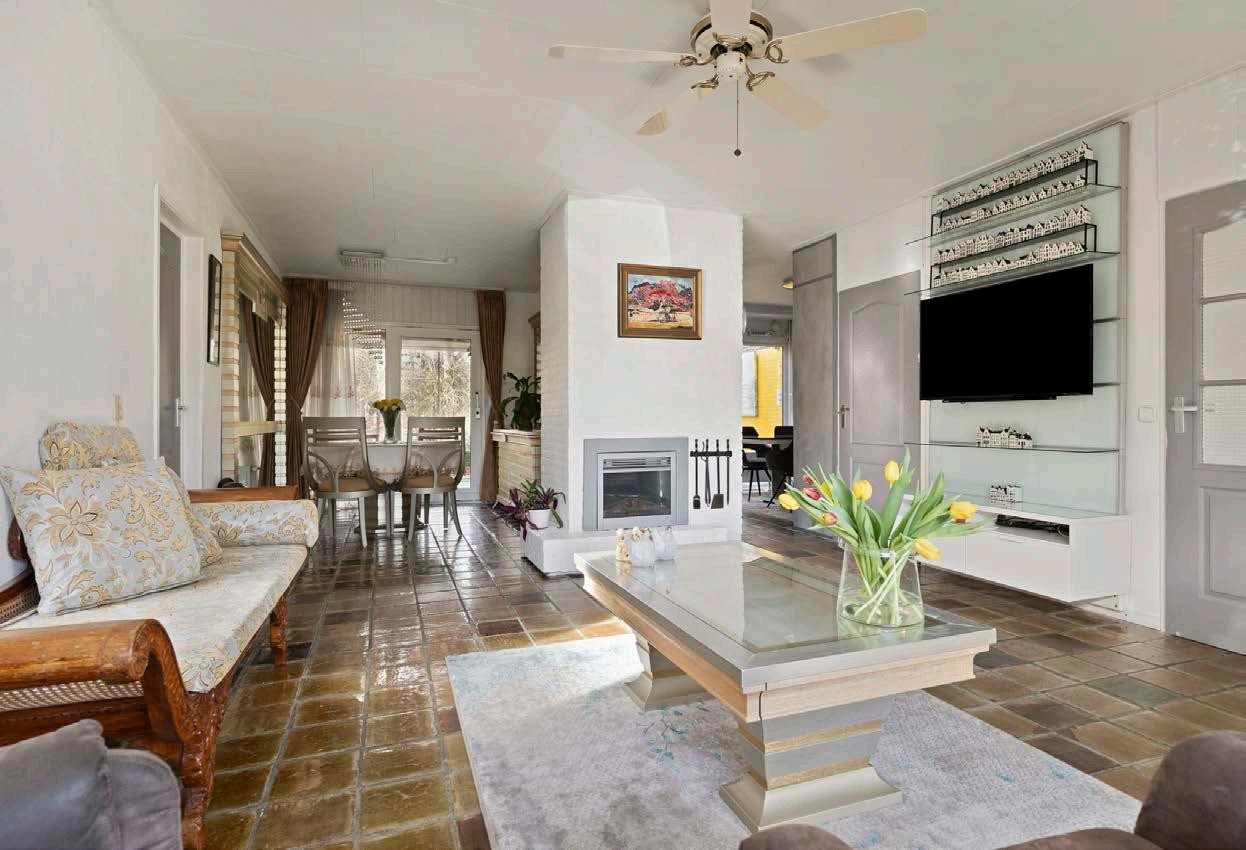 De woonkamer is heerlijk ruim en licht door de grote raampartijen. De charmante gashaard zorgt voor een warme, knusse sfeer. Perfect voor filmavonden met het gezin of een goed boek op een herfstige zondagmiddag.