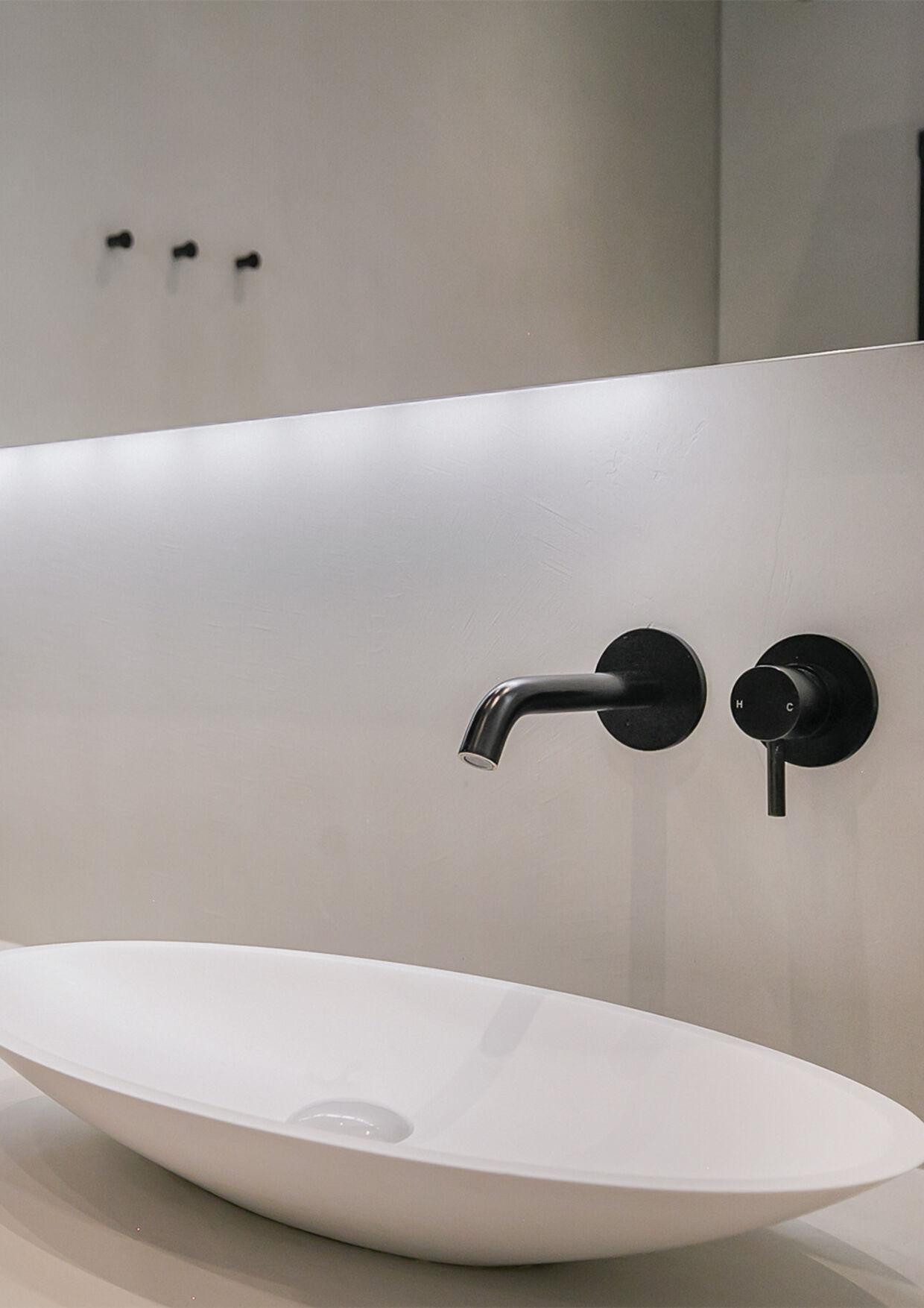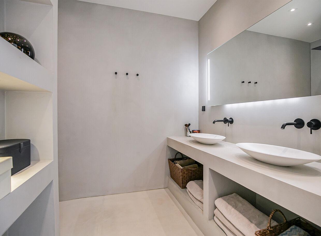 Vanuit de hoofdslaapkamer betreden we de luxe badkamer. Deze is voorzien van een ruime inloopdouche, dubbele wastafel voorzien van strakke zwarte inbouwkranen en praktische inbouwkasten. De wanden zijn voorzien van een mooie beton cire afwerking.