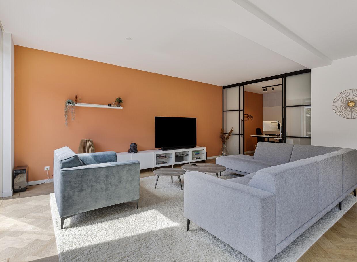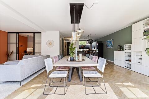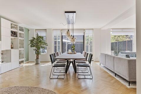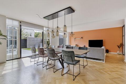 De ruime en lichte woonkamer vormt het hart van het huis en is de perfecte plek voor gezellige avonden met familie en vrienden. Grote raampartijen en een openslaande naar de zonnige tuin zorgen voor een prachtig uitzicht en een overvloed aan natuurlijk licht.
