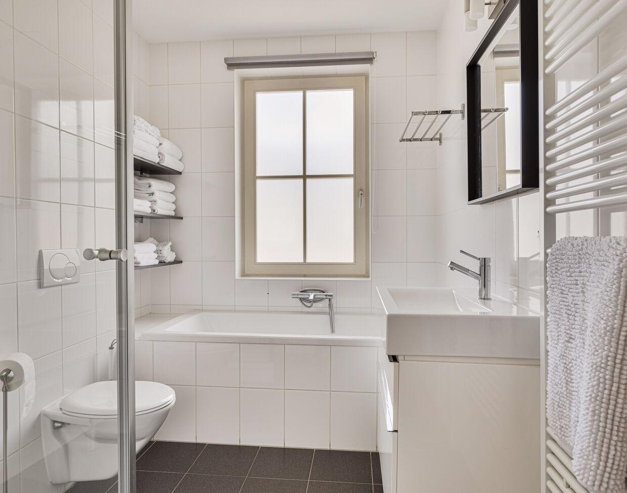 De ruime badkamer op de eerste etage is functioneel ingericht, waardoor de ochtendroutine een stuk soepeler verloopt.