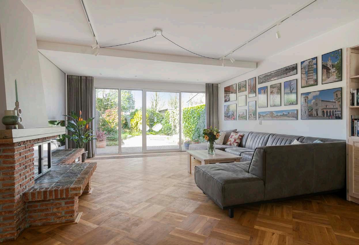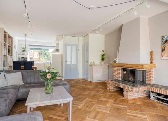 De uitgebouwde woonkamer is heerlijk licht en biedt volop ruimte voor zowel een royale zithoek als een grote eettafel. De stenen schouw zorgt voor extra sfeer en karakter.