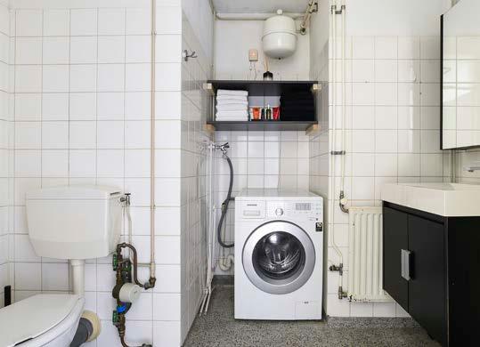 De badkamer beschikt over een wastafelmeubel met opbergruimte, toilet, douche en een aansluiting voor de wasapparatuur.
