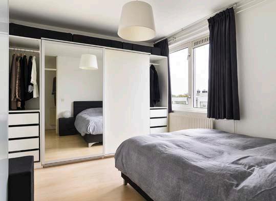 Het appartement telt één slaapkamer. De slaapkamer is van goed formaat, aangenaam licht en keurig afgewerkt in dezelfde stijl als de rest van het appartement.