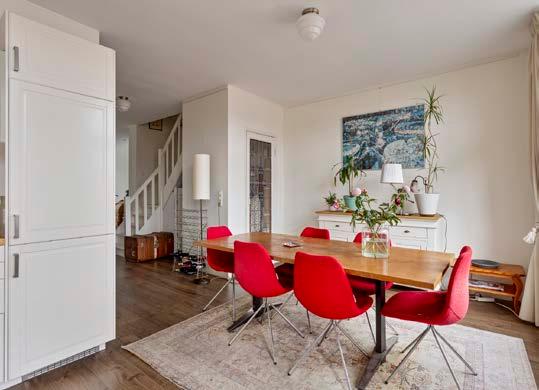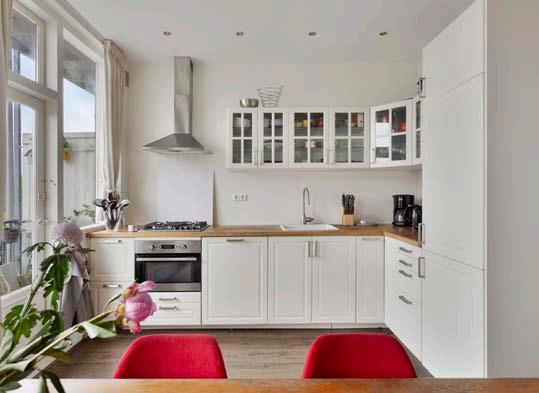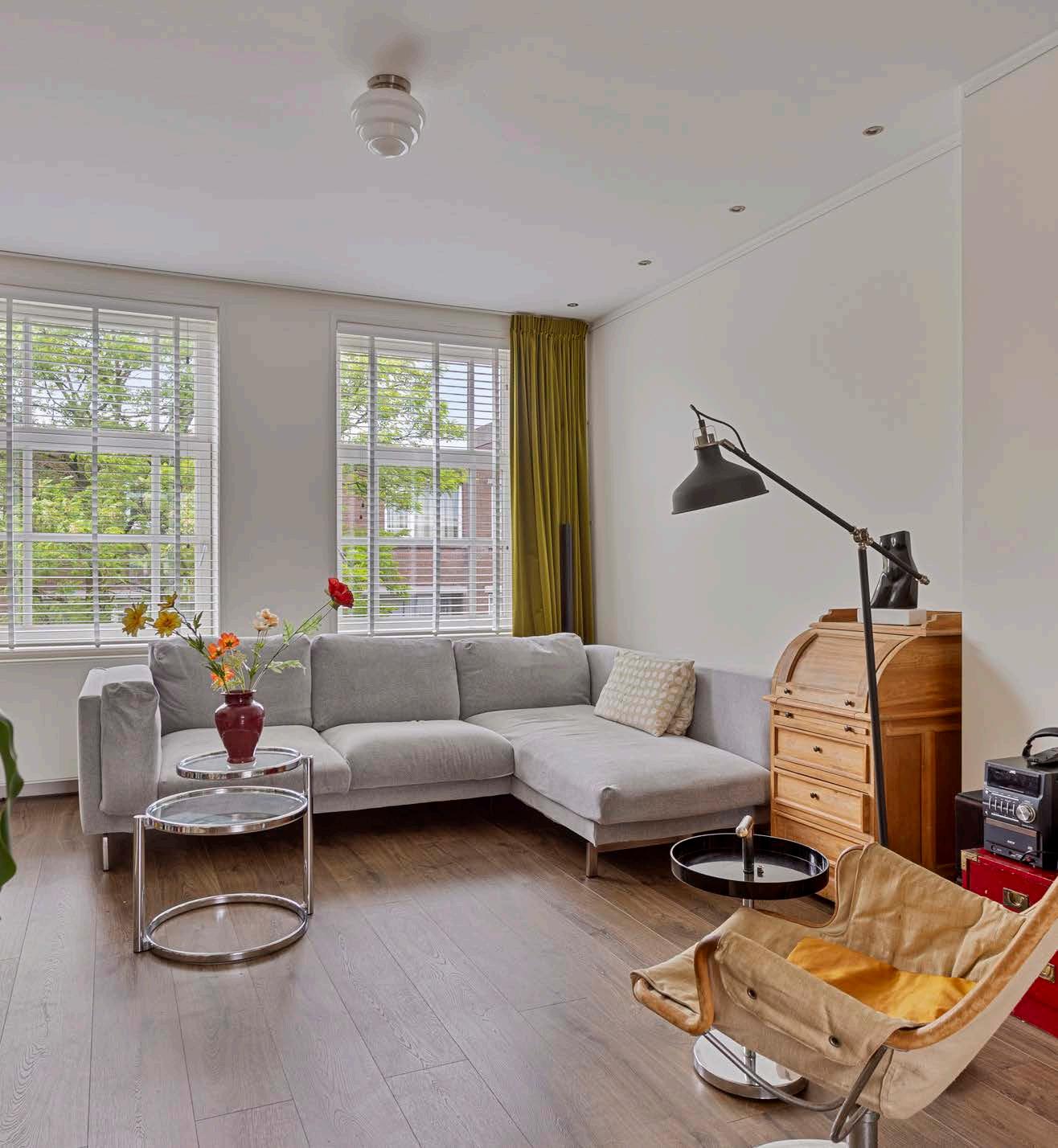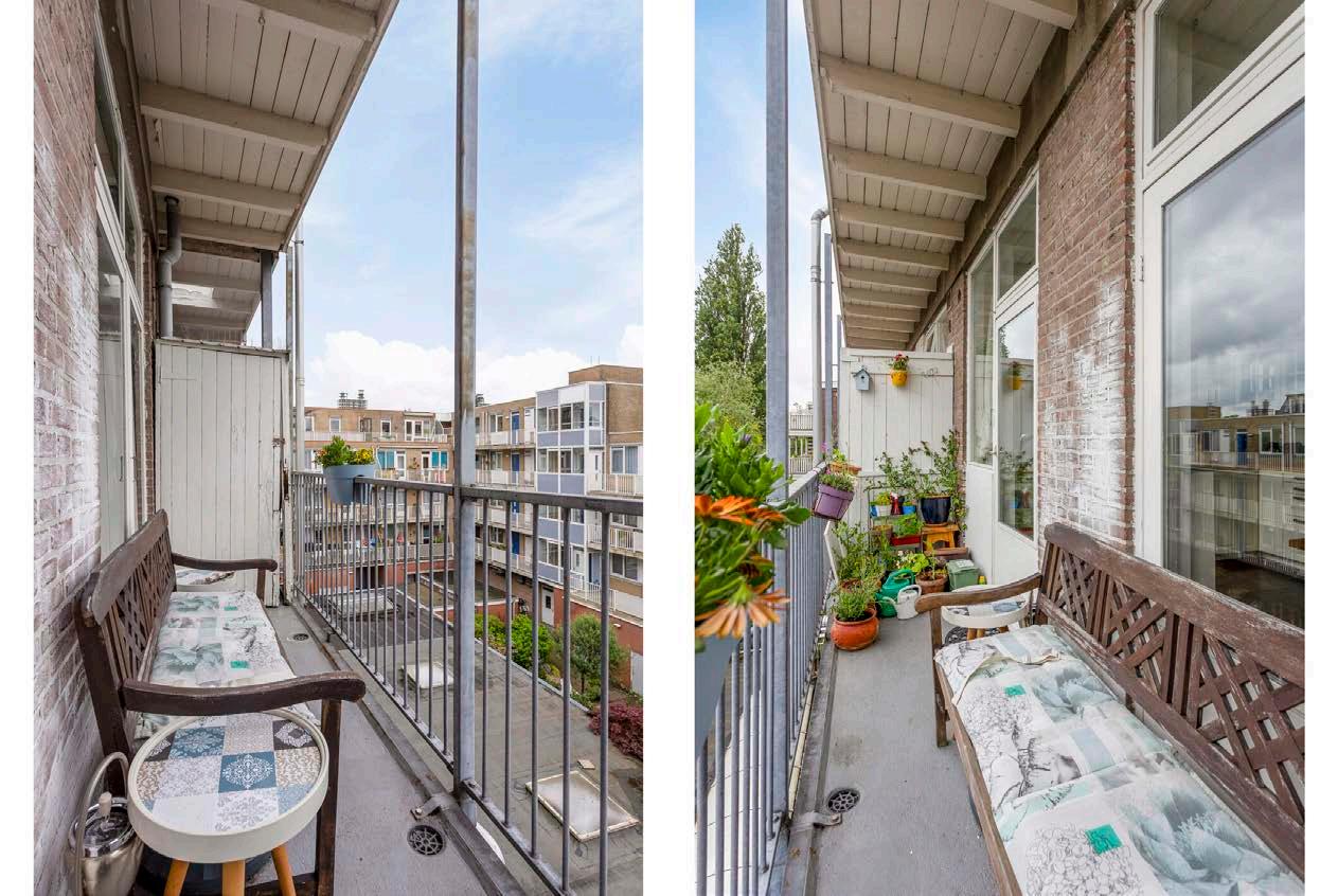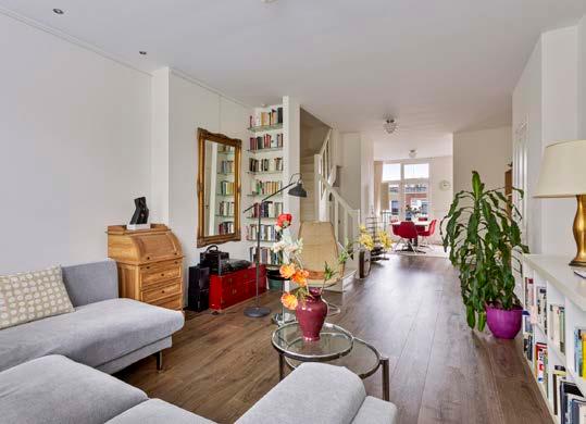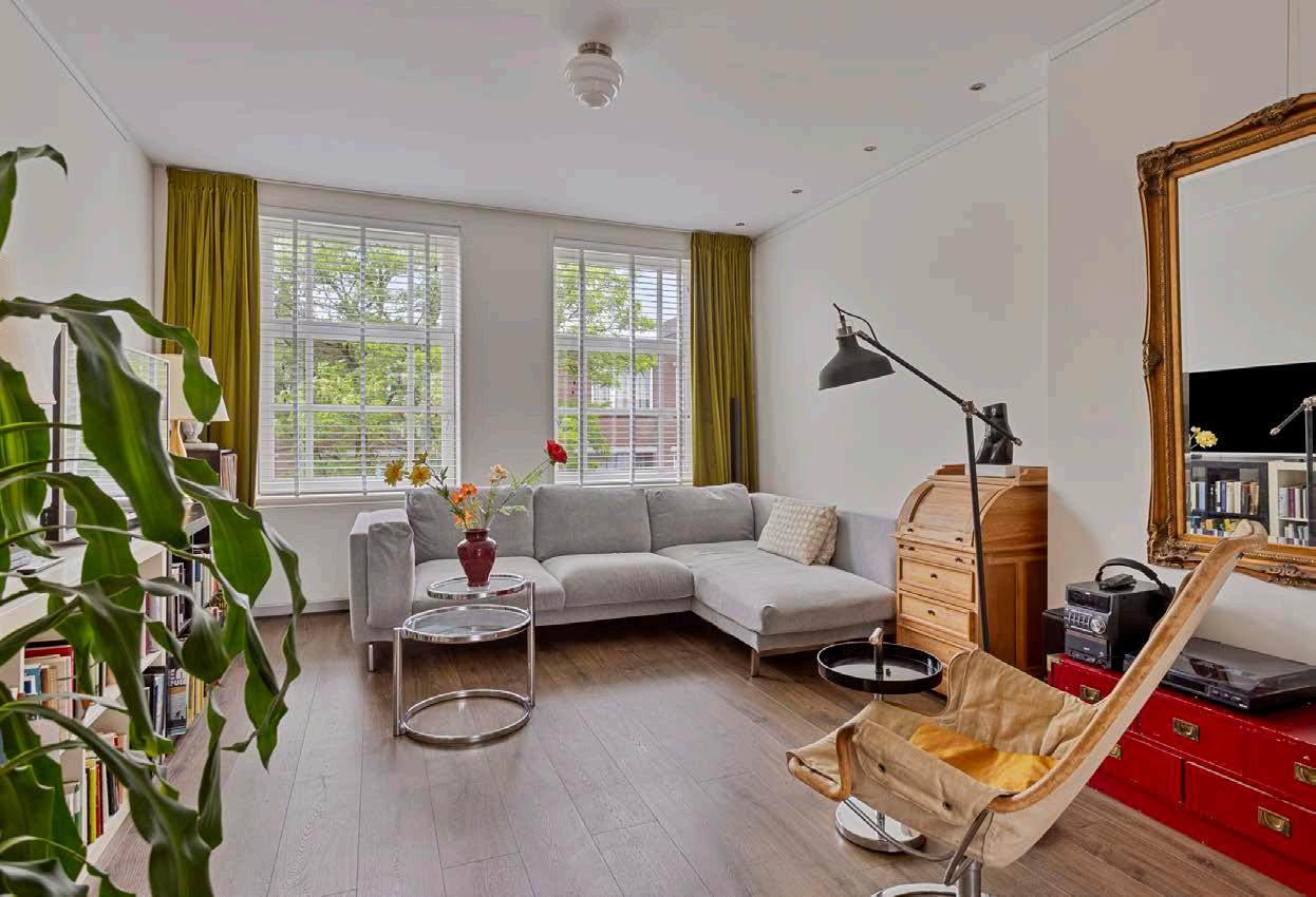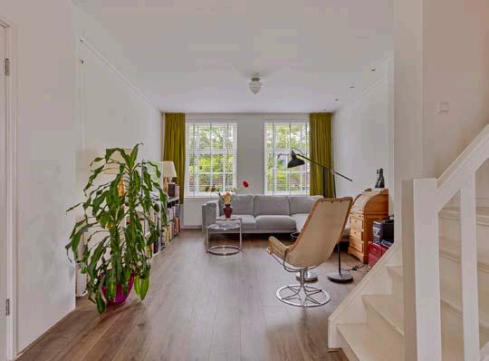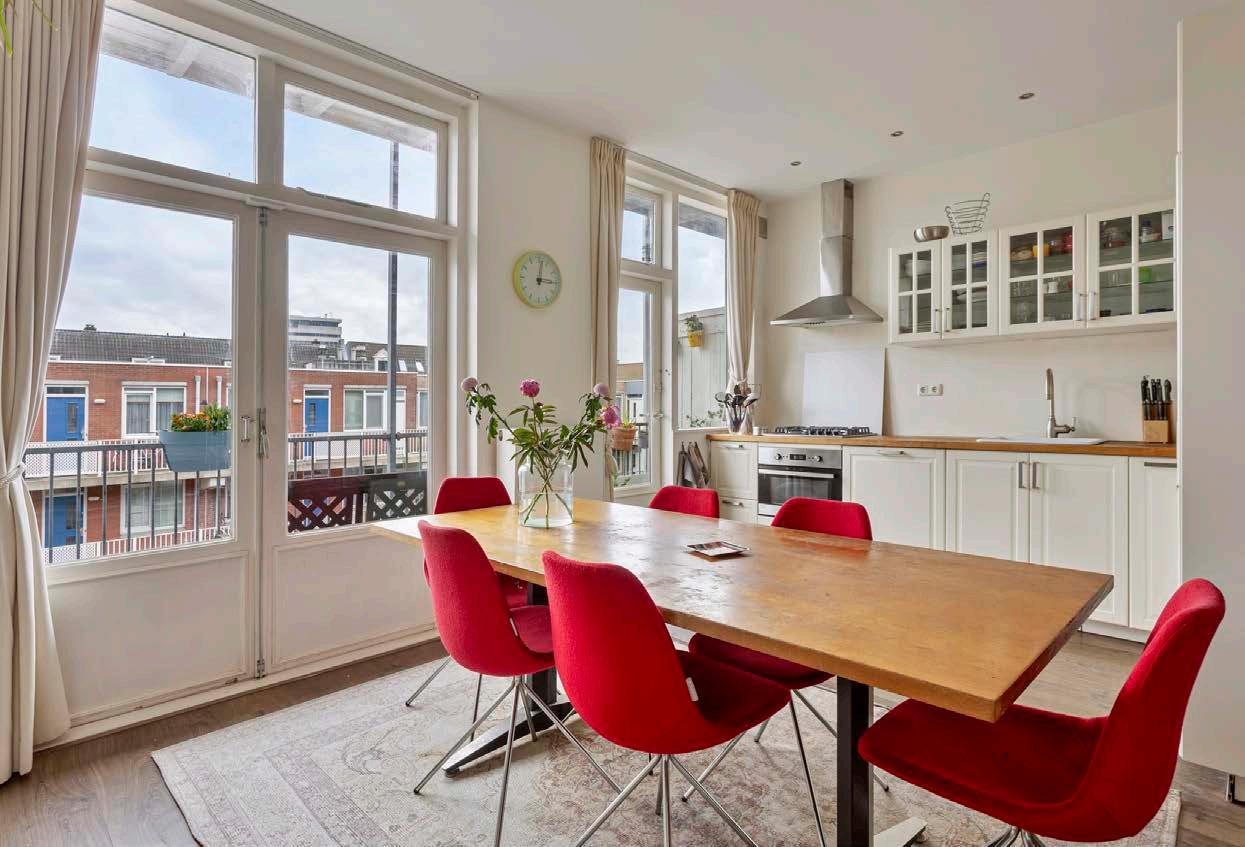 Het is een heel ruime en sfeervolle woning, vooral ook door de trap naar de bovenverdieping. De keuken en het balkon liggen op het zuidoosten, dus ‘s zomers heb je zon tot een uur of vijf. En als je het te warm vindt, is de voorkamer lekker koel, ook door de mooie groene boom voor de mooie ramen.
