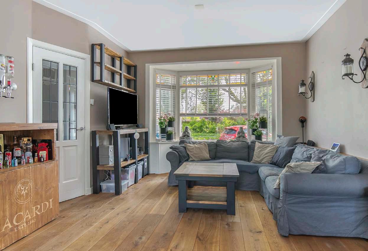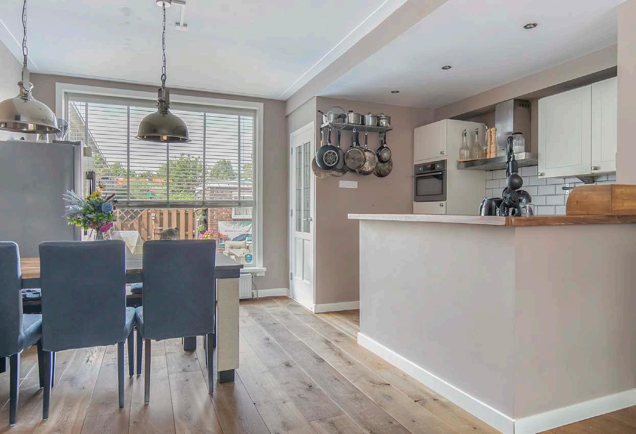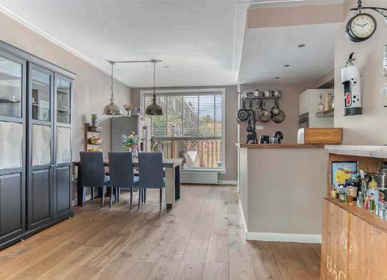 De ruime woonkamer kenmerkt zich door een heerlijke doorzon opstelling met een sfeervolle erker aan de voorzijde en een mooi groot raam aan de achterzijde. Zodoende valt het daglicht hier rijkelijk neer over de gehele lengte van de ruimte. De keurige afwerking, in de vorm van houten vloerdelen en zowel gladde wanden als een glad plafond, maakt dat je hier al snel jouw eigen thuis creëert.