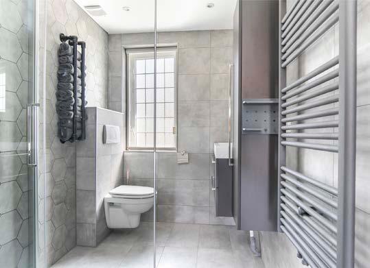 De nieuwe badkamer (2021) is eigentijds betegeld in een neutrale kleurstelling en compleet ingericht met elektrische vloerverwarming, een wastafelmeubel met opbergruimte, zwevend toilet, designradiator en een ruime douchecabine.