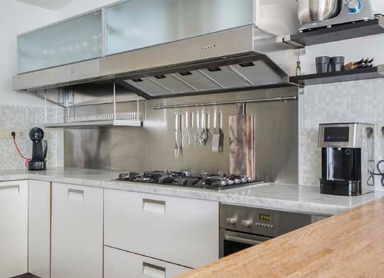 Luxe moderne L-vormige keuken met marmeren blad en diverse inbouwapparatuur o.a. vaatwasmachine, 5-pits gaskookplaat en rvs afzuigschouw. Aansluitend praktische bijkeuken.