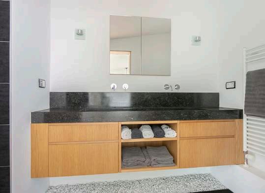 En suite een luxe badkamer met inloopdouche met “Sunshower”, wastafelmeubel met natuursteen, toilet en vloerverwarming.