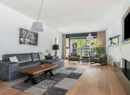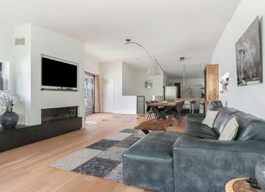 Via hardhouten bordestrap kom je in de royale lichte living met Amerikaans eiken vloer, prachtige sfeerhaard met TV-ruimte, schuifpui naar besloten patioterras (ca. 24 m²) op het zuiden.