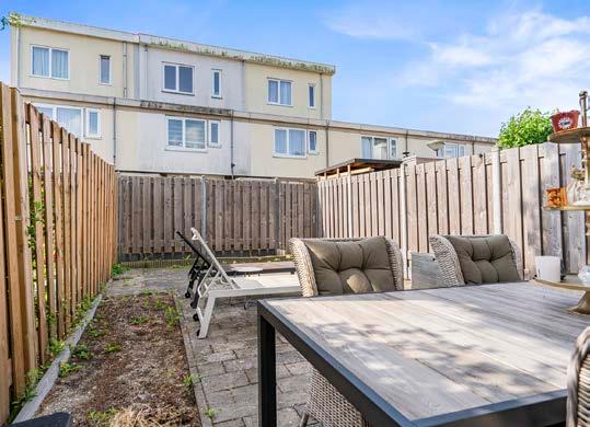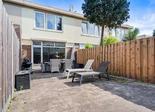 De woning heeft al een aanbouw aan de voorzijde, de berging. Deze hoort bij het ontwerp, de voortuin is hier praktisch betegeld, maar kan net zo kleurrijk worden als we verderop zien in deze buurt. Bij stadsmensen zou je geen groene vingers verwachten, maar in de tuinsteden is dat toch best handig. De bijna tien meter diepe achtertuin op het zuiden is voor het gemak betegeld, maar een boom of struik doen het hier ook heel goed. Er is al een buitenkraan aanwezig. De nog vrijwel nieuwe omheining is over een paar jaar misschien wel helemaal bedekt met blad. Vogeltjes, vlinders, zoemende bijen, dat hoort allemaal bij de biodiverse stad. Achter de schutting ligt een groot plantsoen, beschut door de huizenblokken en benut door de bewoners.