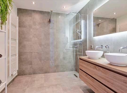 De badkamer bevindt zich op de eerste verdieping en is luxe uitgevoerd met een inloopdouche, badkamermeubel met twee kranen en waskommen, spiegel met verlichting en verwarming en designradiator. Dit maakt het tot een stijlvol geheel. Tegenover de badkamer is het toilet met een fonteintje separaat gelegen.