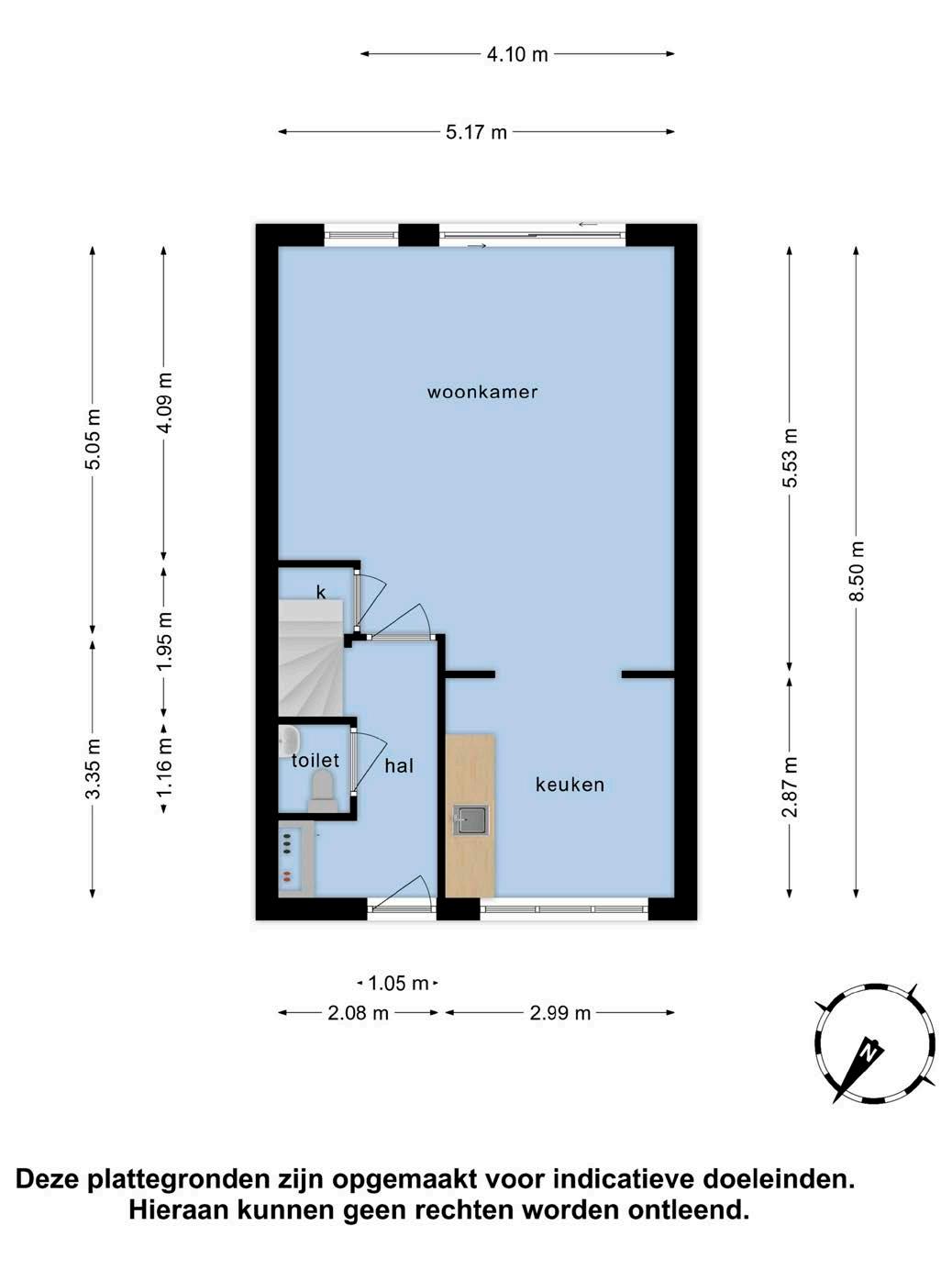 Je komt de woning binnen in de hal met meterkast, toilet met fonteintje en trapopgang met trapkast naar de eerste verdieping. Vanuit de hal kom je de woonkamer binnen.