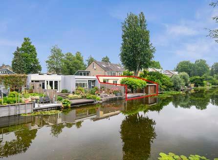 Zowel de woonkamer als de slaapkamer oriënteren zich met grote raampartijen op de met steigerdelen en in verschillende niveaus verdeelde buitenruimte. Een houten berging grenst aan de waterkant, waar de lelies momenteel bloeien en een rustieke blik gunt op het met groen omzoomde wandelpad aan de overkant. Rust!”
