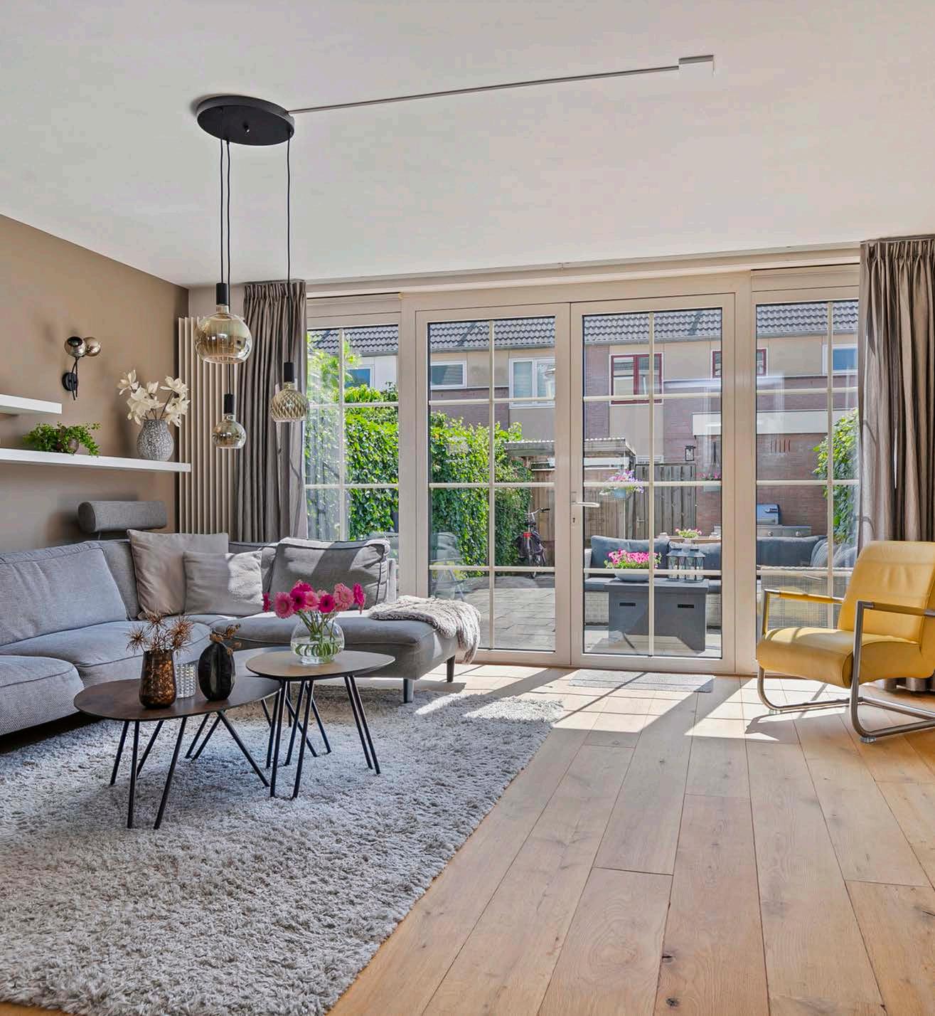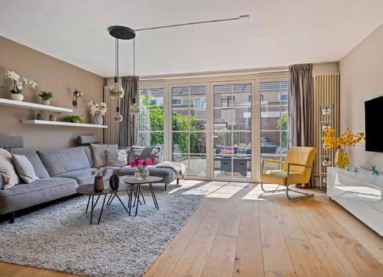 De ruime, lichte woonkamer van 23 vierkante meter biedt volop ruimte. Grote ramen geven een goede lichtinval en bieden een prachtig uitzicht op de fraai aangelegde tuin op het zuiden.