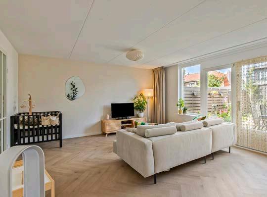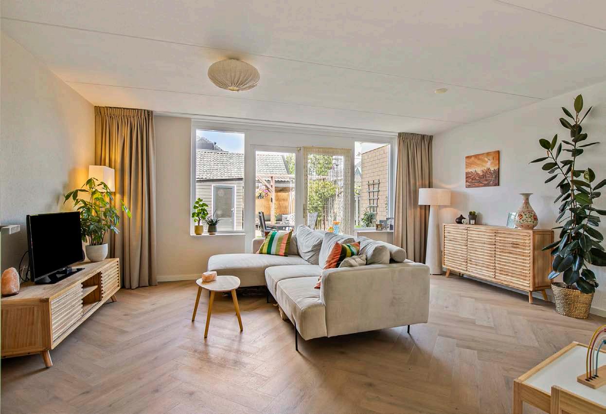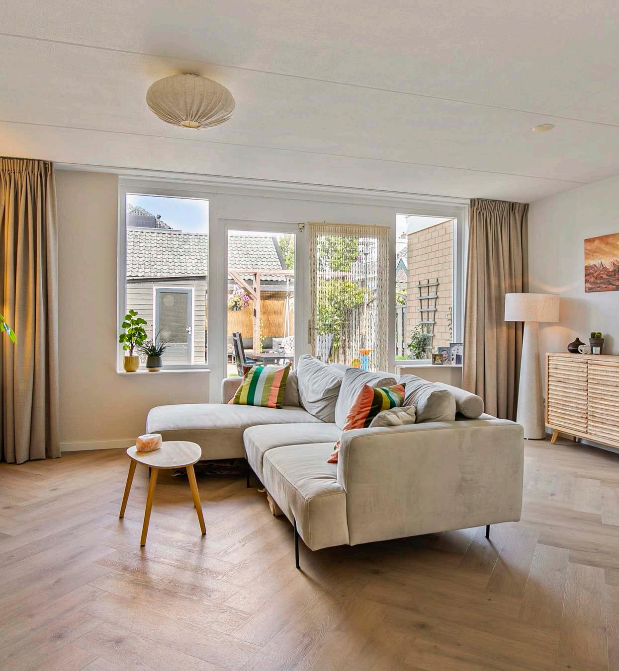 De woonkamer, waar de vloerverwarming uit 2023 een aangename warmte verspreidt. Het zonlicht stroomt door de grote ramen en verlicht het stijlvolle interieur.