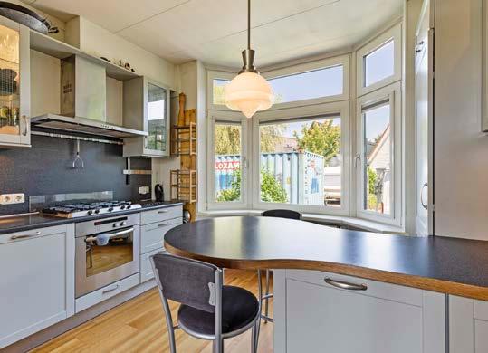 De keuken, die aan de voorzijde van de woning is gelegen, kan afgesloten worden met stijlvolle openslaande deuren. Dit maakt het koken niet alleen een plezier, maar zorgt ook voor een gezellige en huiselijke sfeer.