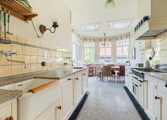 De woonkeuken is een paradijs voor thuiskoks. Met klassiek ogende Falcon fornuis, een groot werk blad en uitzicht op de achtertuin, nodigt deze ruimte uit om heerlijke maaltijden te bereiden.
