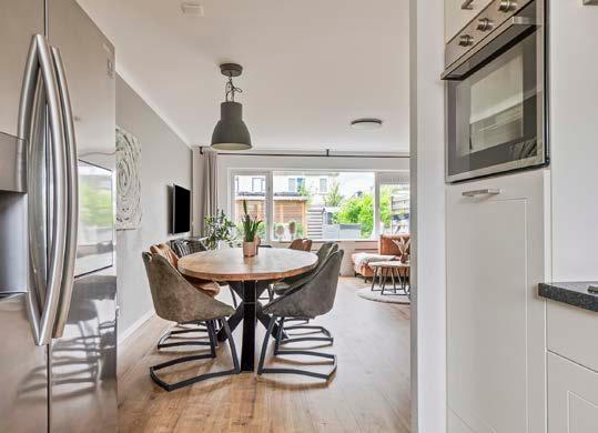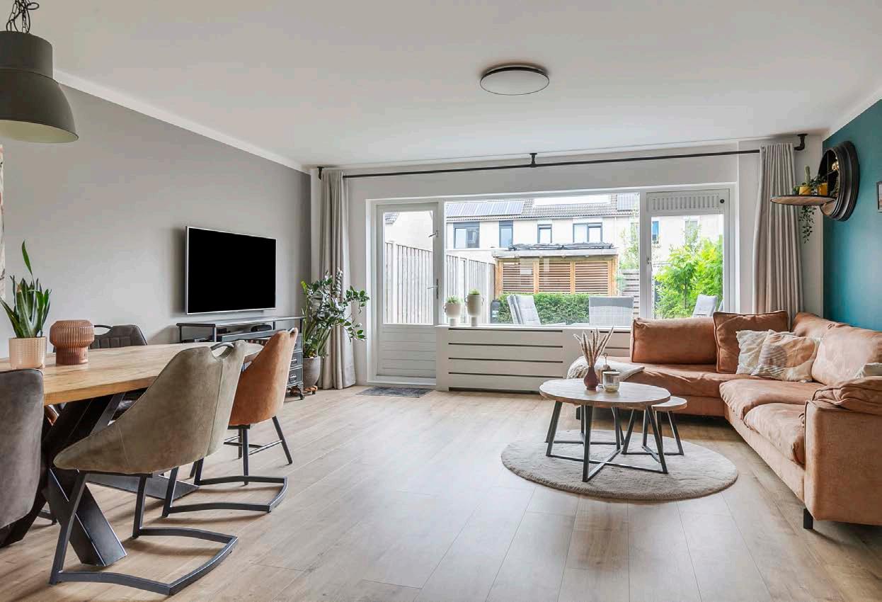 Stap binnen in een ruime hal die direct een gevoel van welkom geeft. Hier vind je een modern toilet, meterkast, garderobe en trapopgang. De deur naar de woonkamer opent naar een lichte, royale ruimte dankzij de grote raampartijen. De L-vormige keuken, voorzien van diverse moderne apparatuur, biedt volop ruimte en gemak bij het bereiden van heerlijke maaltijden. De gehele woning is afgewerkt met strak glad stucwerk en stijlvolle laminaatvloeren, wat bijdraagt aan een moderne en verzorgde uitstraling. Hier voel je je direct thuis.