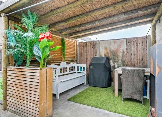 De diepe achtertuin op het noord-westen is een ware oase van rust en privacy. Met houten schuttingen, kunstgras, borders en een sfeervolle houten veranda, is dit de ideale plek om te ontspannen en te genieten van lange zomeravonden. De stenen berging biedt voldoende opbergruimte voor fietsen, tuingereedschap en meer, waardoor de tuin zowel praktisch als aantrekkelijk is. Hier kun je genieten van het buitenleven in alle comfort.