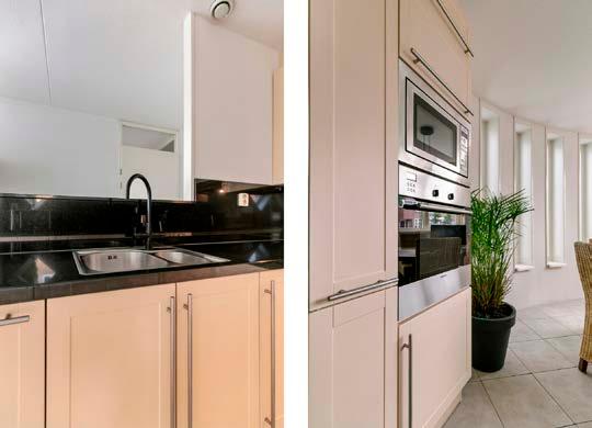 De keuken is van alle gemakken voorzien en heeft een praktische indeling. Je kunt hier heerlijk koken terwijl je geniet van het uitzicht op de voortuin en op de eettafel aan de voorzijde van de keuken.