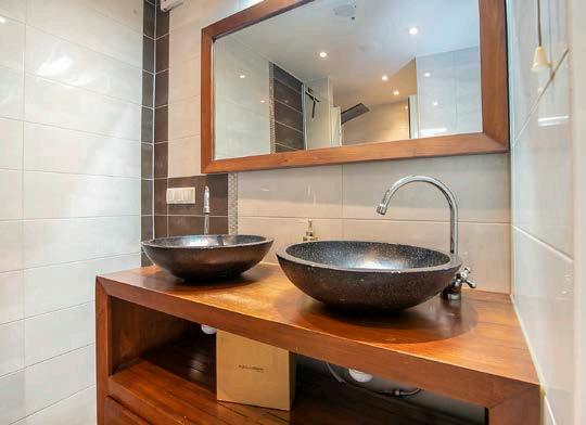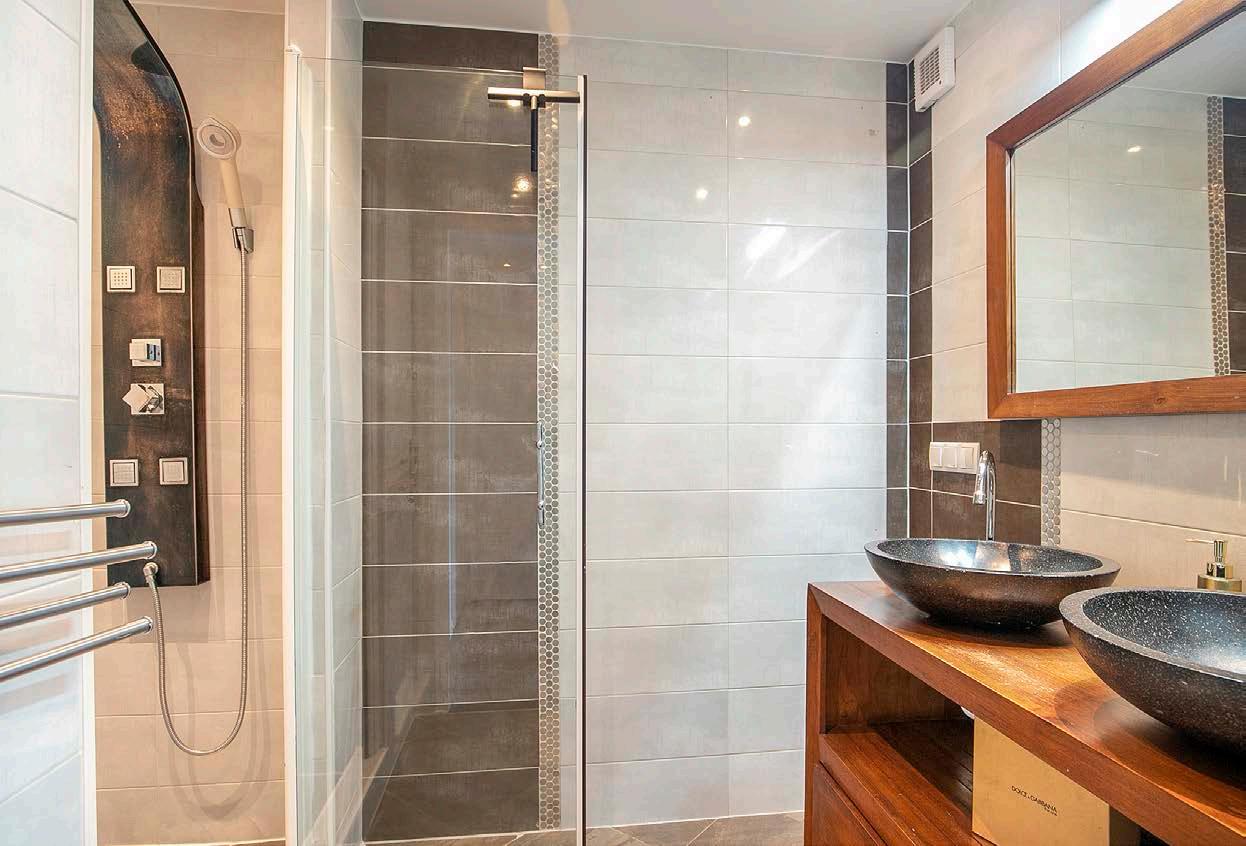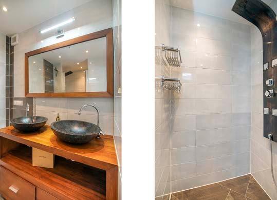 De moderne en ruime badkamer is vernieuwd in 2016 beschikt over een inloopdouche en een houten wastafelmeubel met twee wasbakken en lades. Het separate toilet is bereikbaar vanuit de gang. Daarnaast is er een handige kast met aansluiting voor de wasmachine.