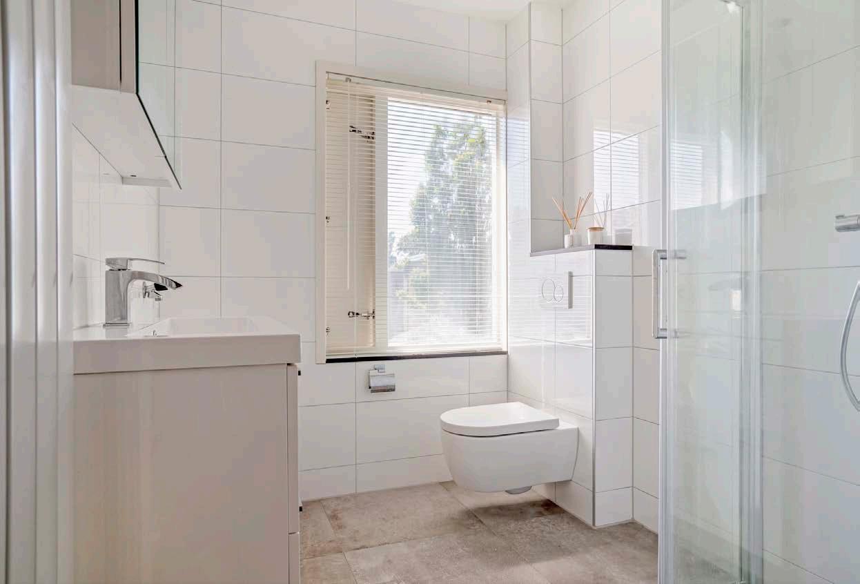 De badkamer, vernieuwd in 2017, biedt een moderne en frisse uitstraling. Volledig betegeld met grijze en witte tinten, voorzien van een wastafelmeubel met spiegelkast, zwevend toilet en een aparte douchecabine. Het aanwezige raam zorgt niet alleen voor natuurlijk daglicht, maar ook voor extra ventilatie. De opstelling voor de wasmachine en de droger bevindt zich in de kast op de overloop en zijn aangesloten op eigen elektra groepen.