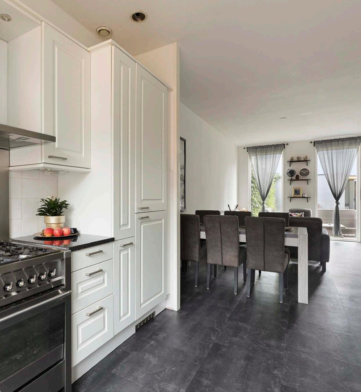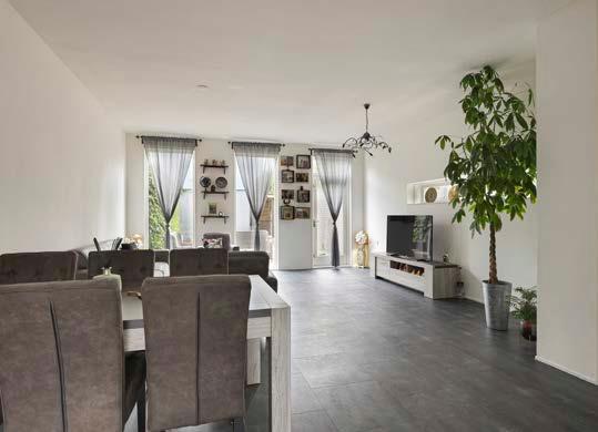 De woonkamer is tuingericht en dankzij de grote ramen en de deur naar de achtertuin, valt hier aangenaam veel daglicht naar binnen. Het geheel is netjes afgewerkt met een pvc vloer met comfortabele vloerverwarming en behang in neutrale tinten op de wanden. In de woonkamer heb je genoeg ruimte voor een fijne zithoek en een gezellige eethoek.