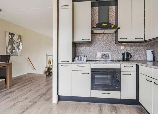 Aan de voorzijde van het huis vind je een eetkamer met aansluitend de nette open keuken. Deze keuken is geplaatst in een L-opstelling, waardoor je beschikt over voldoende kast- en werkruimte. Daarnaast is de keuken uiteraard voorzien van de nodige inbouwapparatuur, zoals een keramische kookplaat, afzuigkap, koelkast, vriezer en vaatwasser. Tevens is er voldoende ruimte om een gezellige eethoek te creëren.