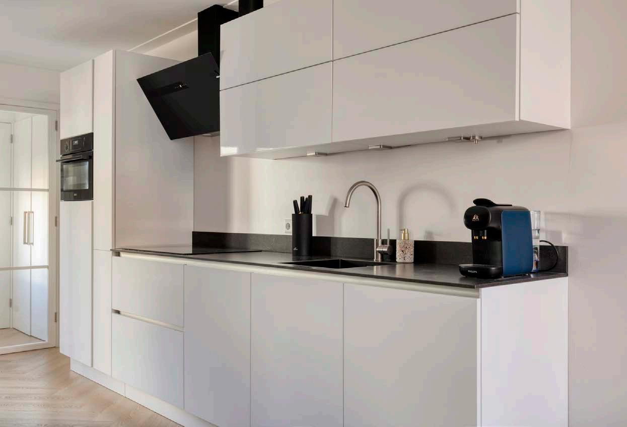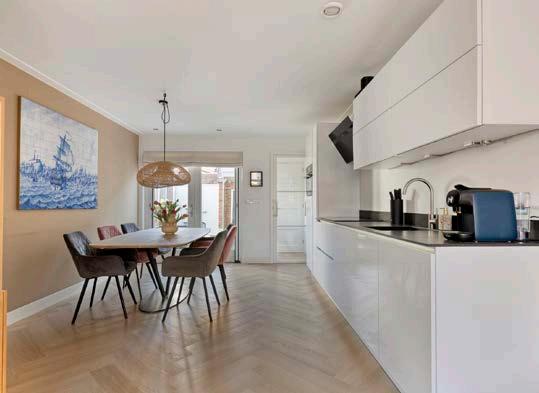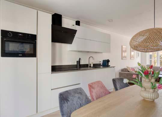 De open keuken sluit naadloos aan op de woonkamer en is uitgevoerd met diverse inbouwapparatuur, waaronder een vaatwasser, inductiekookplaat, combi-oven, afzuigkap en koelkast. Hiermee is de keuken niet alleen stijlvol, maar ook praktisch ingericht voor dagelijks gebruik.