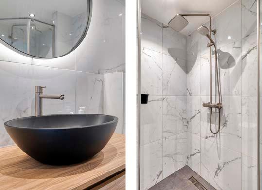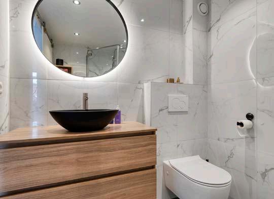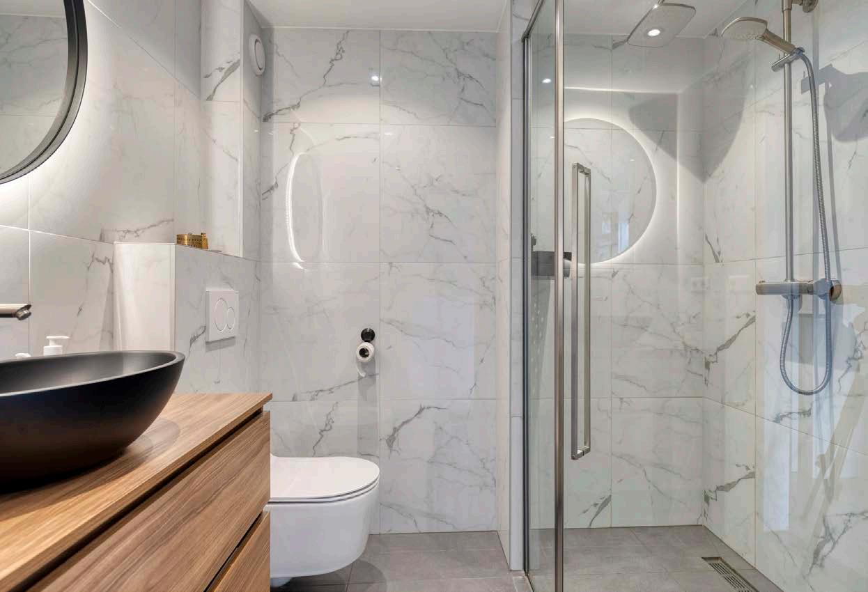 De badkamer is luxe uitgevoerd en beschikt over een douche, toilet en wastafelmeubel.