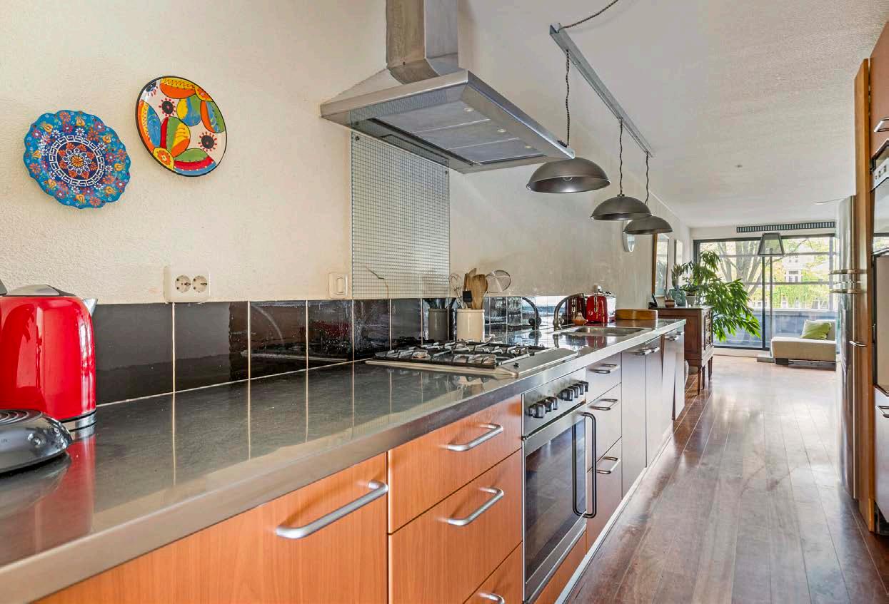 De doorzon woonkamer vormt het hart van de woning en is een ware blikvanger. Met grote ramen aan zowel de voor- als achterzijde, stroomt het natuurlijke licht ongehinderd binnen, wat zorgt voor een heldere en uitnodigende sfeer. Het uitzicht op de groene tuin en de betoverende Schinkel voegt een extra dimensie toe aan deze ruimte, waardoor elke dag een visuele traktatie wordt.