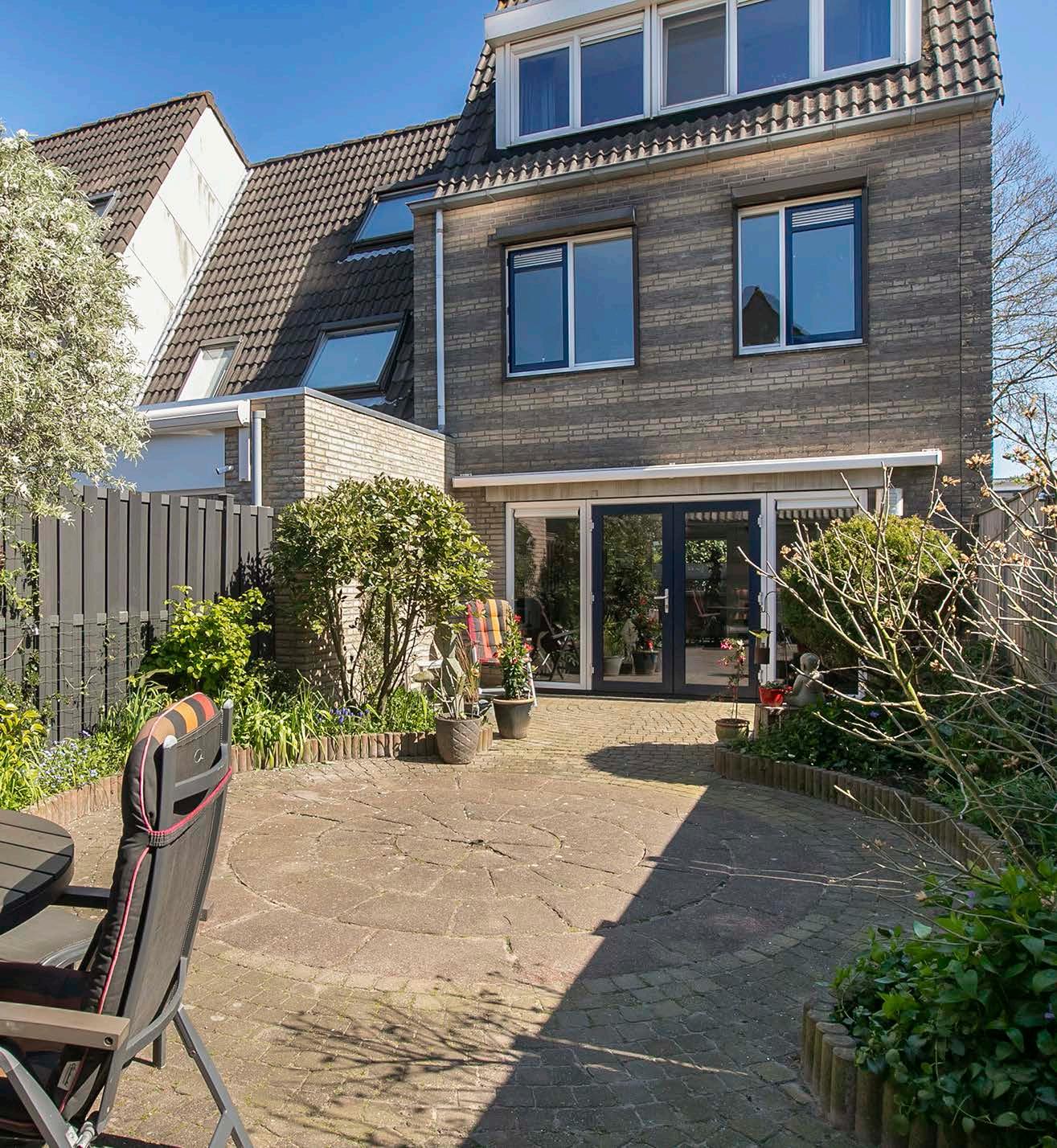 Middels de openslaande deuren stappen we de achtertuin in die is gelegen op het westen. De tuin is fraai aangelegd met een mix van bestrating en groene beplanting. Daarnaast heb je de beschikking over een eigen achterom. Er is genoeg ruimte voor een loungeplek, waar je in alle rust van de tuin kunt genieten. Verder is de garage via de achtertuin te bereiken, wat erg praktisch is. En heb je extra parkeer mogelijkheid voor garage.