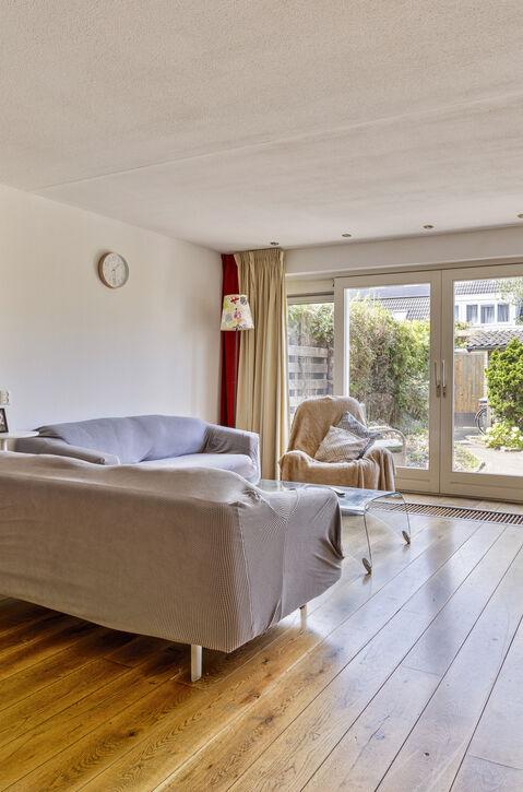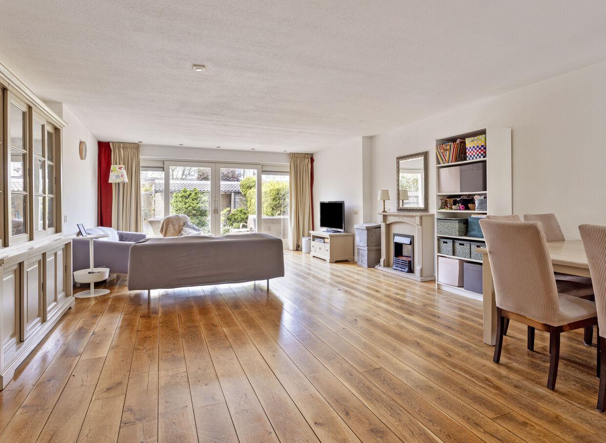 De eikenhouten vloer in de woonkamer straalt warmte en karakter uit, terwijl de grote schuifpui naar de tuin een overvloed aan natuurlijk licht binnenlaat.