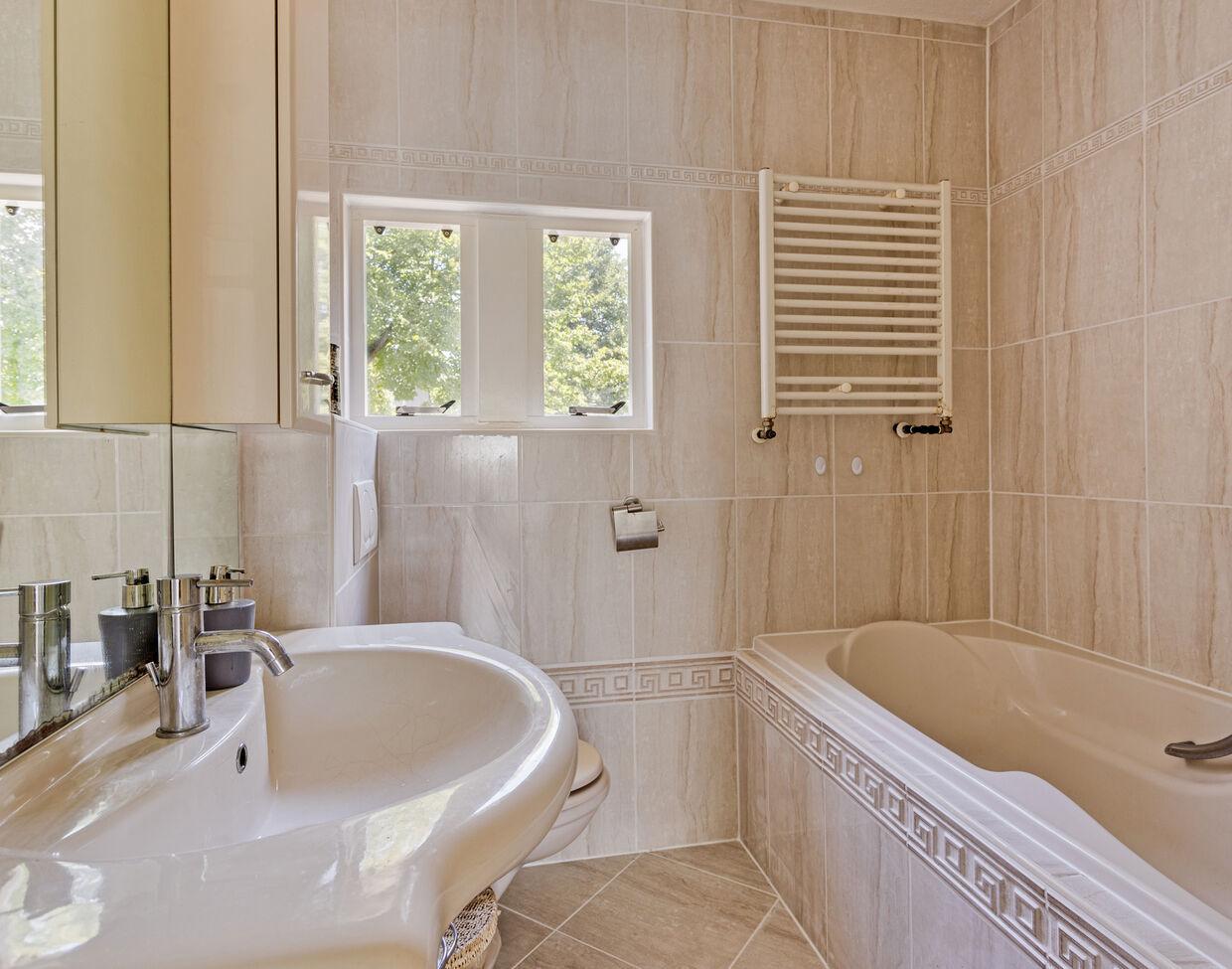De badkamer is verzorgd en functioneel, met een ligbad dat uitnodigt tot ontspanning na een lange dag.