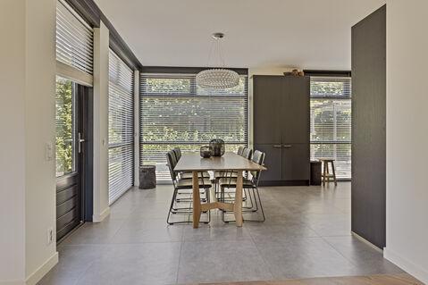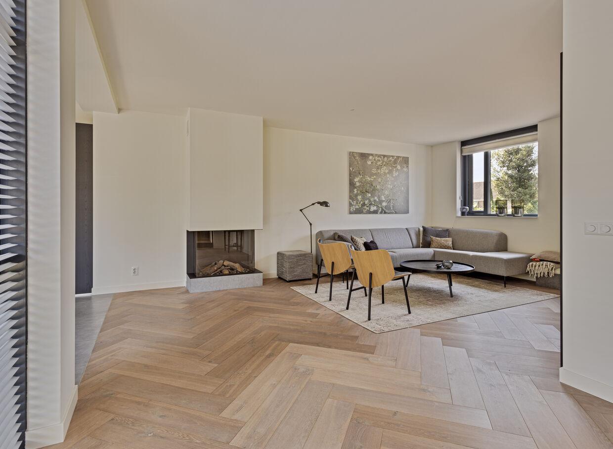 In deze villa vind je een stijlvolle begane grond met een prettige woonkamer met een Eiken visgraatvloer, fraaie stalen taatsdeuren en een op maat gemaakt wand/TV-meubel.