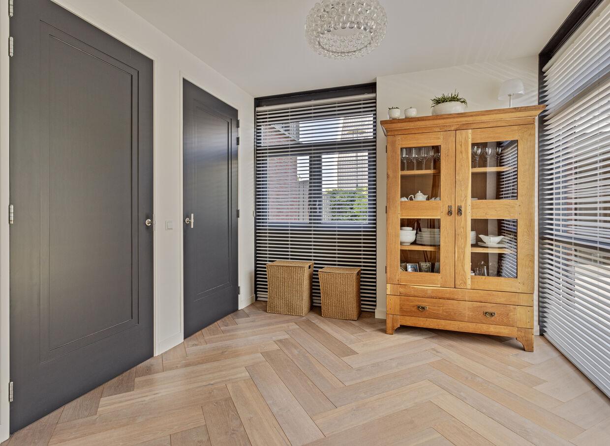 Indezevillavindjeeenstijlvollebeganegrondmet eenprettigewoonkamermeteenEikenvisgraatvloer, fraaiestalentaatsdeureneneenopmaatgemaakt wand/TV-meubel.Ookisereenwerkkamer,ideaal voorthuiswerkenofalsrustigeplekvoorstuderen.De werkkamerisstrategischgeplaatst,zodatjeinalle rustenprivacykuntwerkenzonderafgeleidte worden door het dagelijks leven in huis.