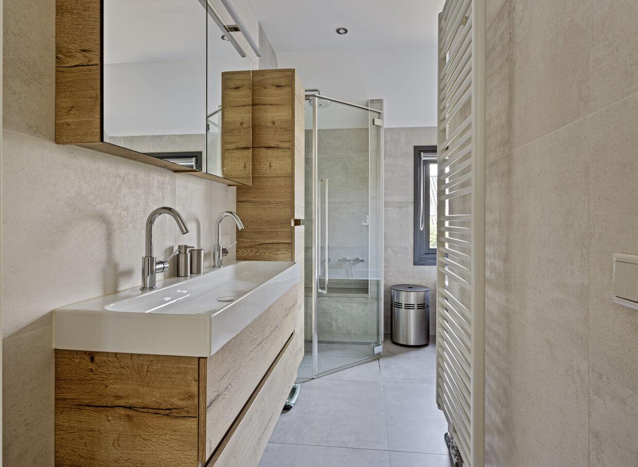 In de badkamer beschik je over een dubbel wastafelmeubel, douche en een ligbad.