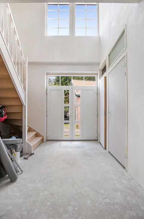 Royale entree met op maat gemaakte trap naar de eerste verdieping en voldoende bergruimte onder de trap voor jassen en schoenen.