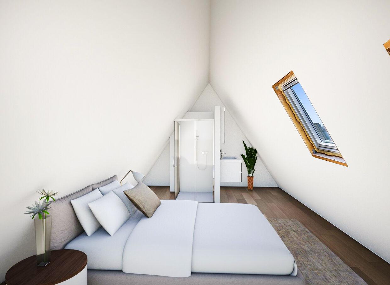 Middels de vaste trap is de tweede verdieping bereikbaar. Op de overloop bevindt zich de cv-ketel en de wasmachine-/droger aansluiting. De verdieping biedt ook twee slaapkamers met grote dakramen. Hier is ook de mogelijkheid om een kleine badkamer of keukentje te realiseren.