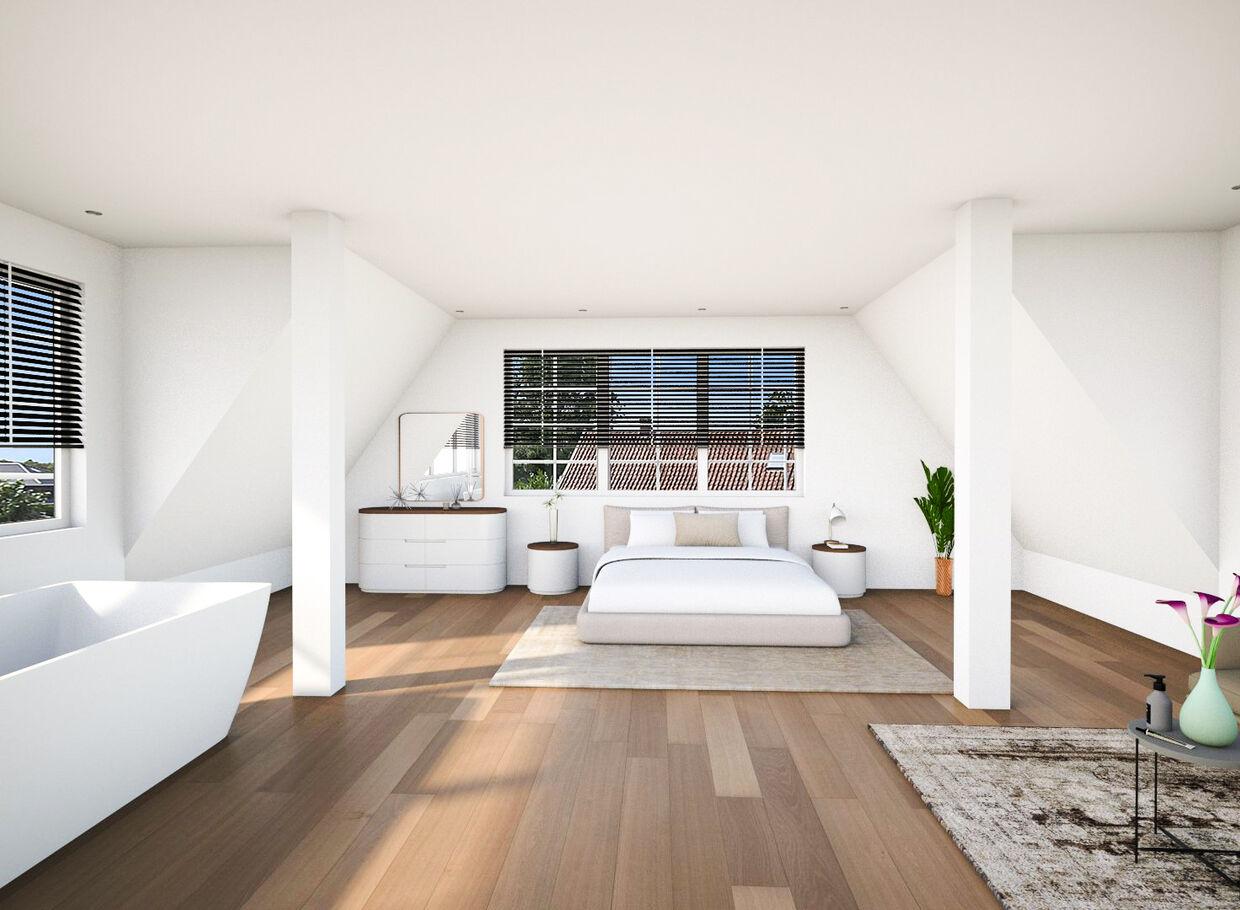 Net als op de begane grond is de afwerking hier casco, waardoor je volledige vrijheid hebt om de ruimtes naar eigen inzicht in te richten. Ook deze verdieping is volledig voorzien van vloerverwarming.