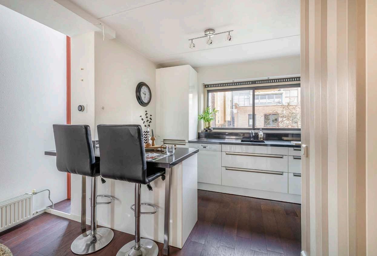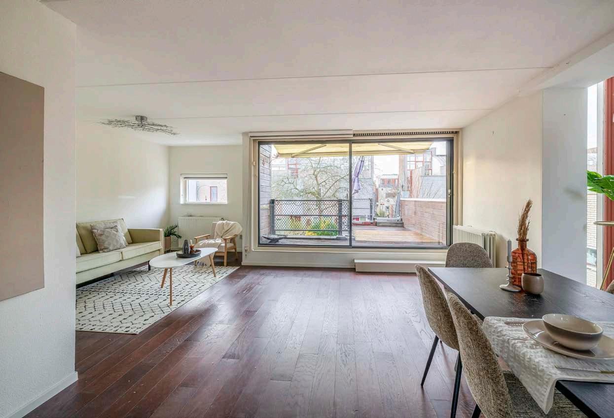 Op de eerste verdieping ontdek je het hart van de woning: een lichte en ruime woonkamer met een grote schuifpui naar het balkon. Stel je voor: na een drukke werkdag schuif je de deur open en geniet je met een glas wijn van de laatste zonnestralen op je balkon. Nog een pluspunt: via een trap sta je zó in de zonnige achtertuin met achterom. Hier kun je heerlijk loungen, tuinieren of barbecueën met vrienden en familie.