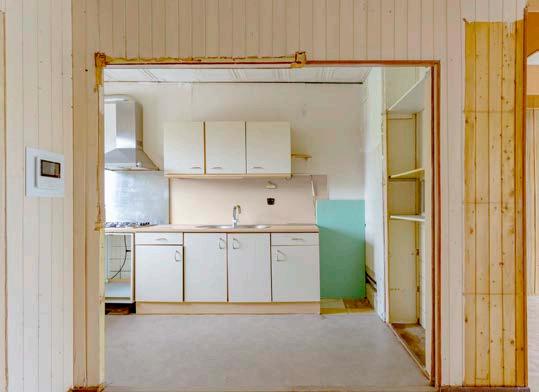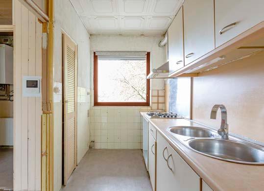 Grenzend aan de woonkamer is de semi open keuken bereikbaar. De keuken gelegen aan de galerijzijde dient eveneens gemoderniseerd te worden, maar biedt zeer veel ruimte om een zeer functionele keuken te plaatsen waar elke thuiskok met voldoening aan zijn of haar creaties kan werken.