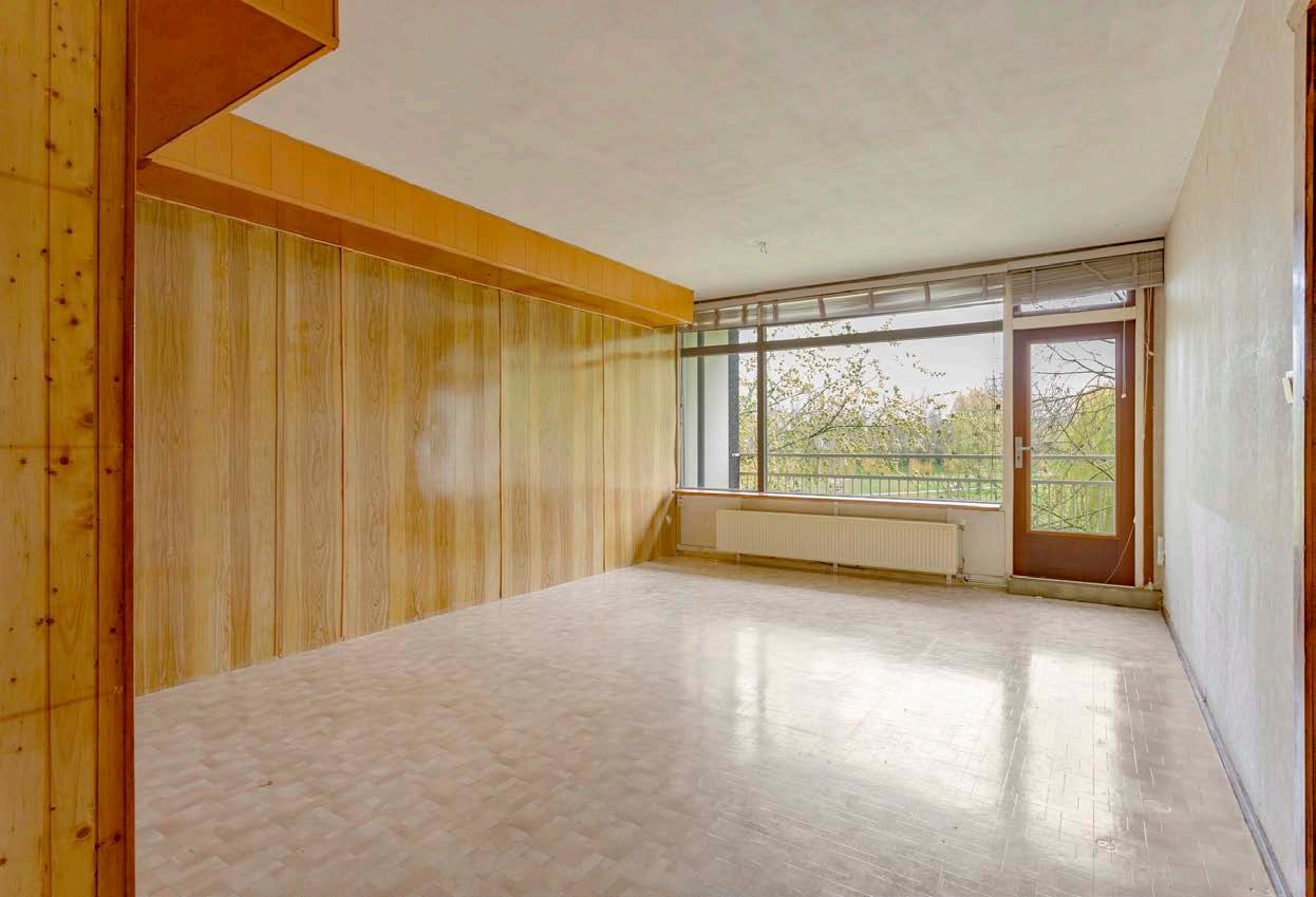 De woonkamer met grote raampartij en toegang tot het royale balkon. Vanaf dit balkon en de grote glaspartij geniet je in elk jaargetijde van het heerlijke uitzicht over het park.