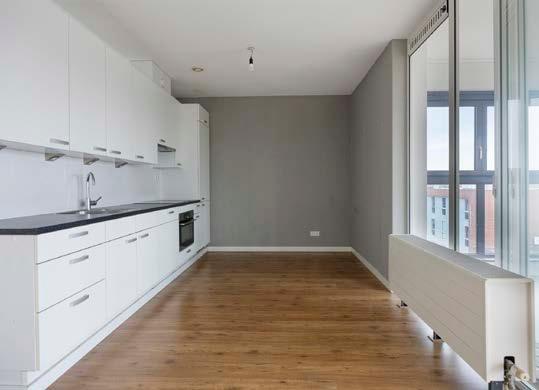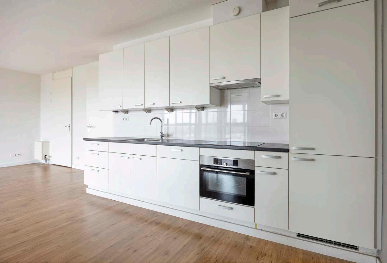 Het gaat hier om een moderne open keuken in een praktische L-opstelling, strak uitgevoerd in lichte tinten. Hierdoor ademt de ruimte een frisse, hedendaagse sfeer, terwijl de open indeling zorgt voor een gevoel van verbondenheid met de rest van het appartement. Je kunt tijdens het koken gezellig in contact blijven met je gasten, met uitzicht op de mooie woonkamer. Uitgerust met inbouwapparatuur is de keuken niet alleen stijlvol maar ook zeer functioneel.