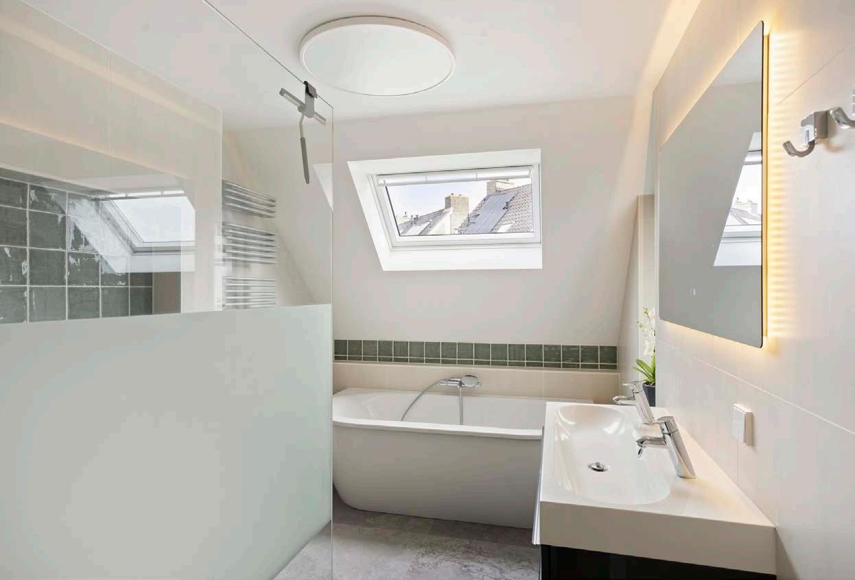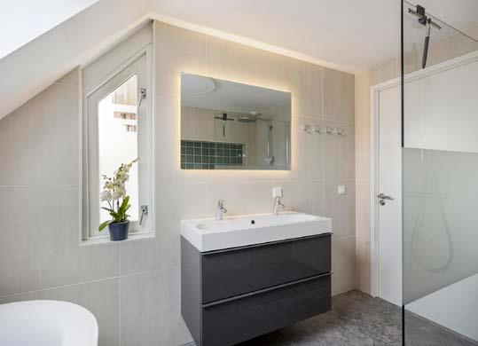 De moderne luxe badkamer is ook gelegen aan de voorzijde van de woning en is voorzien van een inloopdouche, ruim half vrijstaand ligbad en wastafelmeubel met 2 kranen, een handdoekradiator en vloerverwarming. Het tweede aparte moderne toilet bevindt zich naast de badkamer