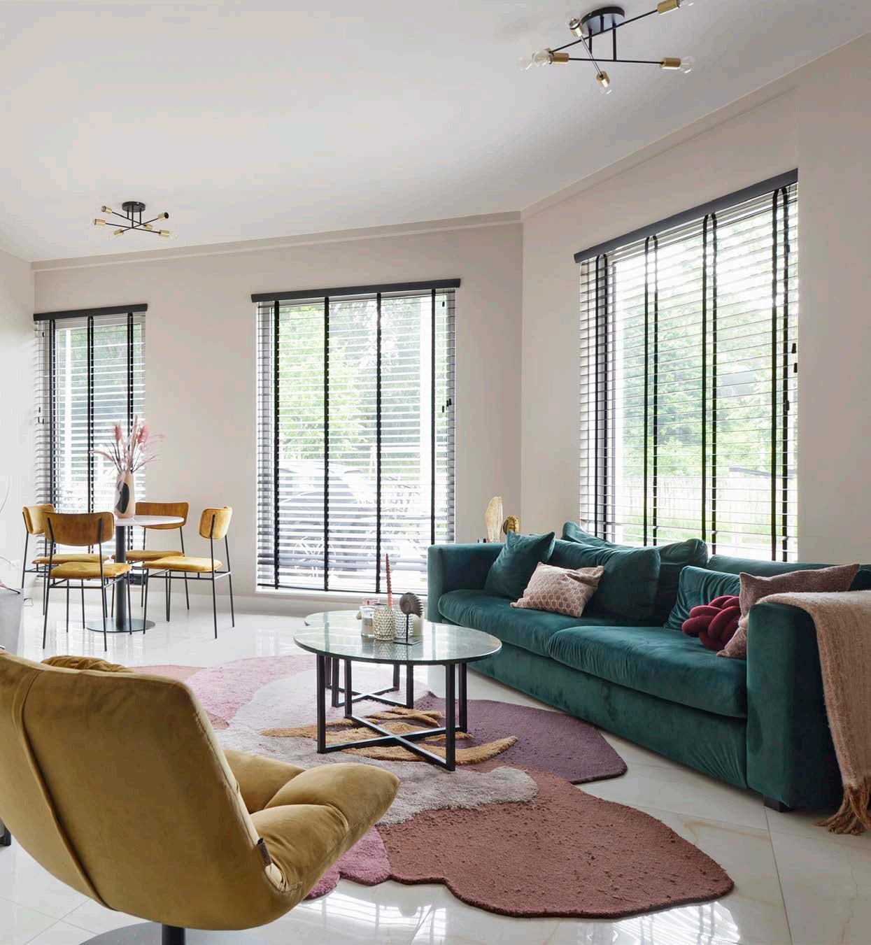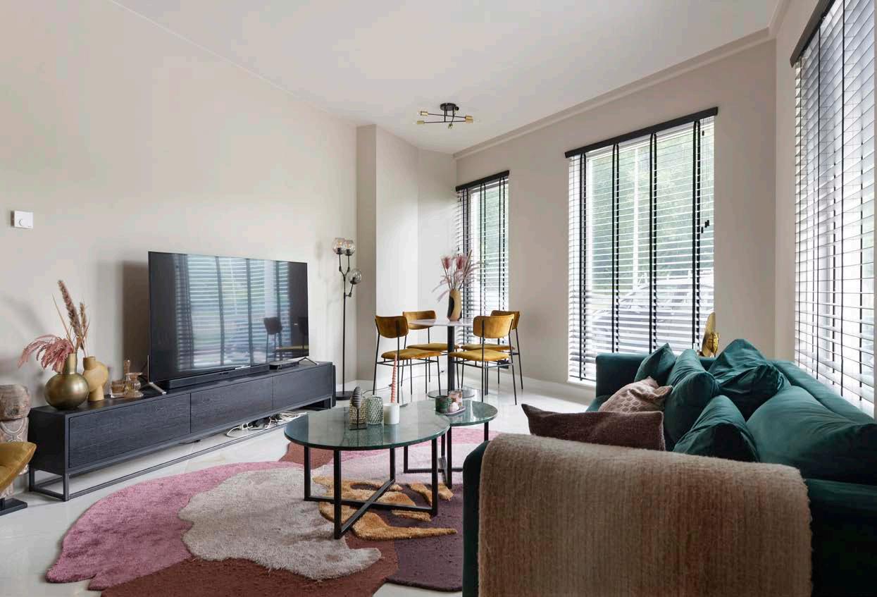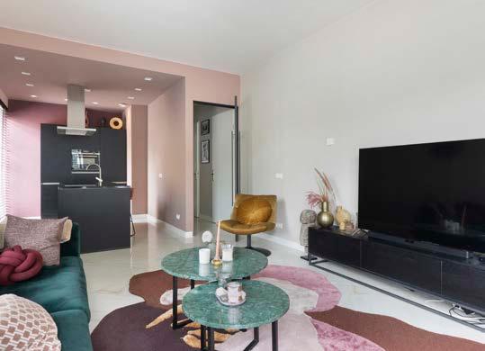 De woonkamer kenmerkt zich door een speelse vorm en een stijlvolle afwerking met een witte tegelvloer in marmerlook, vloerverwarming en strak gestucte wanden.