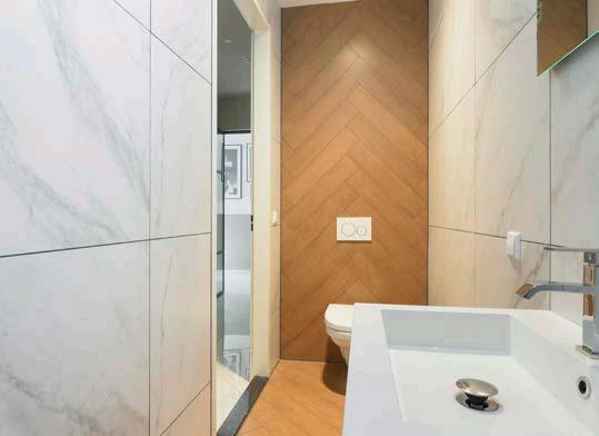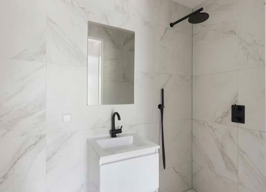 De eerste badkamer is volledig betegeld in dezelfde stijl als de woonkamer en keuken, en beschikt over een toilet, wastafel en inloopdouche.