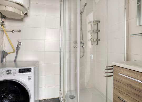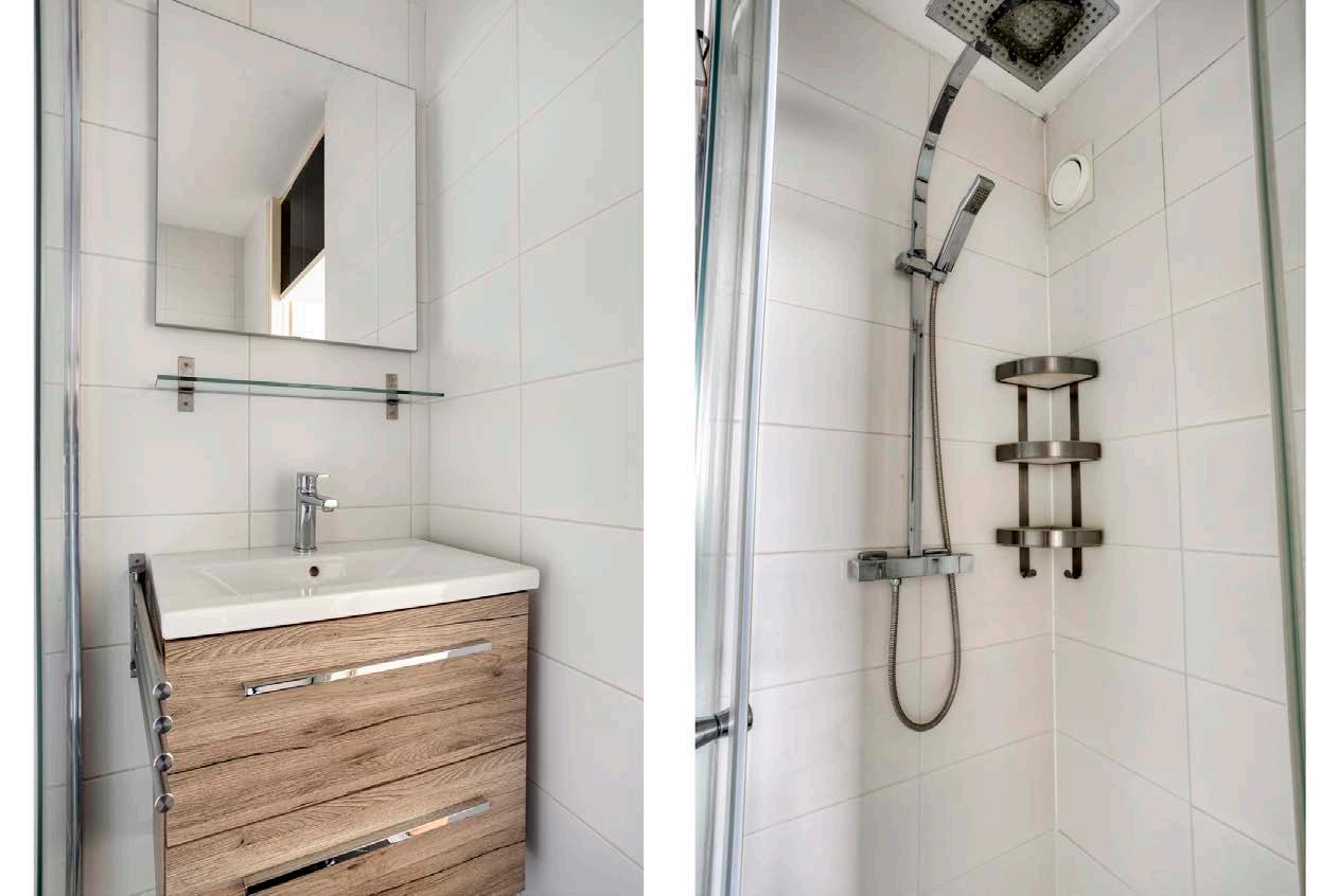 De badkamer is praktisch ingedeeld en vanuit de slaapkamer loop je zo de badkamer in. De ruimte is uitgerust met een douche en een wastafelmeubel, waardoor comfort en functionaliteit samenkomen. Daarnaast is er een aansluiting voor de wasmachine aanwezig.