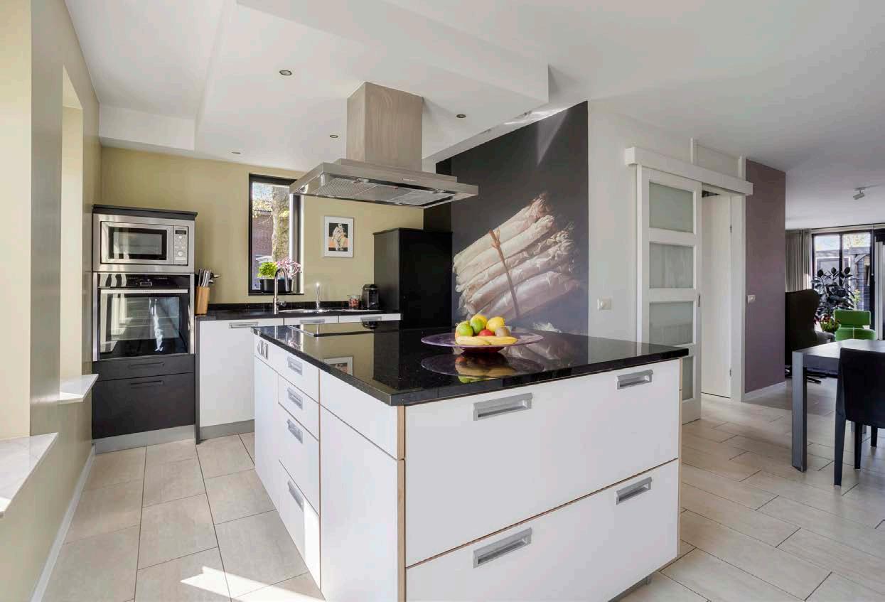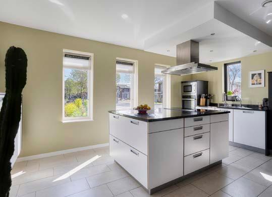 Aan de voorzijde bevindt zich de stijlvolle keuken: een droom voor iedere thuiskok! Het moderne kookeiland, met 5-pits inductiekookplaat, vormt het hart van de ruimte. Daarnaast biedt de keuken voldoende opbergruimte, een heetwaterkraan, koel/vriescombinatie, oven, magnetron en een vaatwasser. Hier zet je moeiteloos een driegangendiner op tafel voor vrienden of familie.